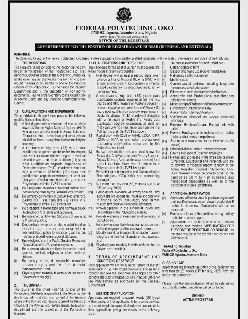 The Governing Council of Federal Polytechnic Oko invites suitable candidates for the position of Registrar and Bursar of the Polytechnic